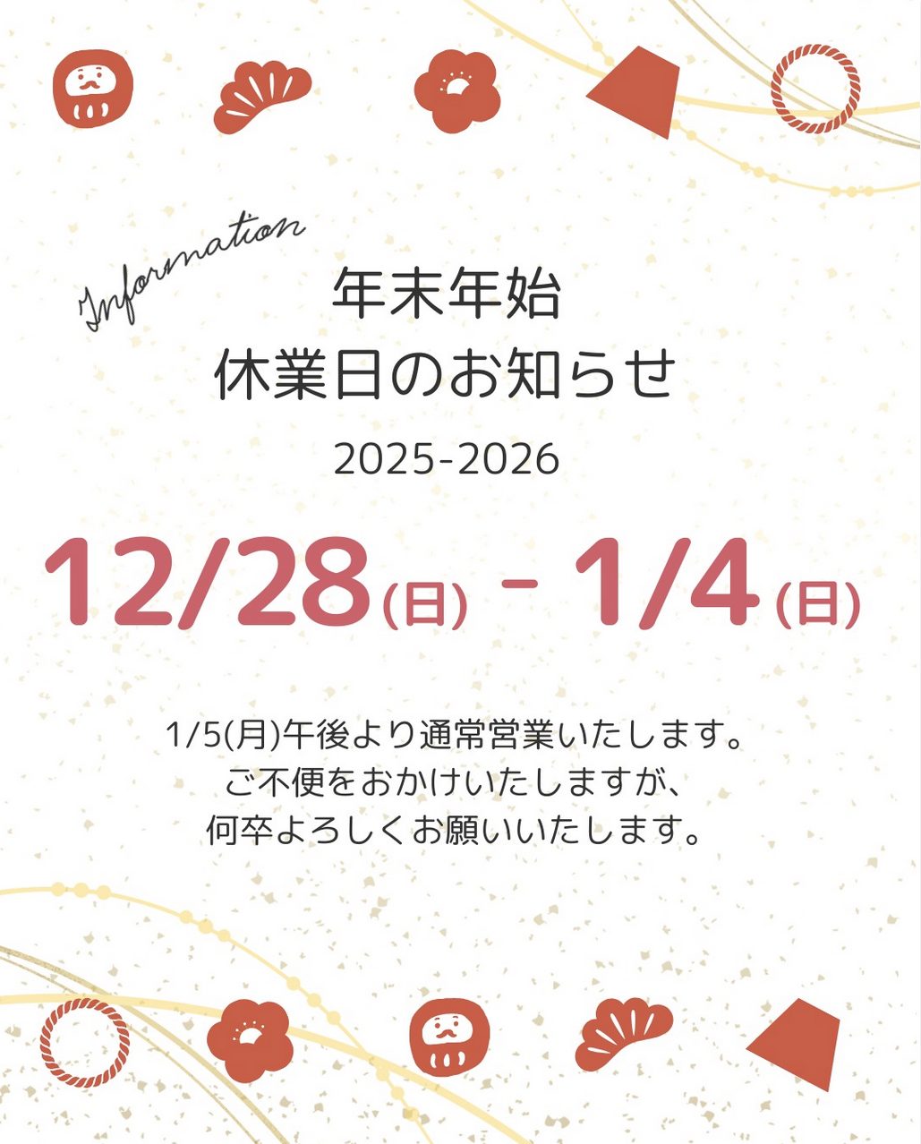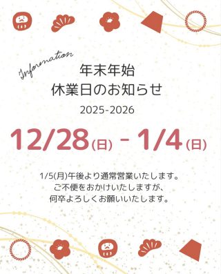 2025年12月28日(日)~2026年1月4日(日) なお2025年1月5日(月)午後より通常営業いたします。 期間中はお電話でお問い合わせ頂いてもご対応ができません、あらかじめご了承のほどよろしくお願いいたします。 またメール、Fax等で頂いたご相談等につきましては、1月5日以降随時ご対応させて頂きます。 皆さまにはご不便おかけいたしますが、何卒よろしくお願いいたします。 詳しくはこちら -